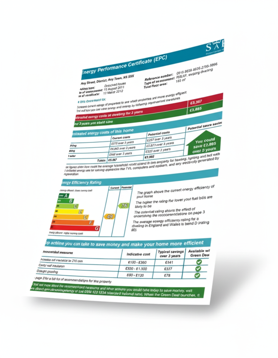 By law, an Energy Performance Certificate (EPC) is required whenever a property is sold, rented, or built in the UK. The EPC shows your property’s energy efficiency rating, from A (most efficient) to G (least efficient). It also includes details about energy use, estimated costs, and recommendations for improving efficiency.